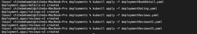 kubectl apply -f deploymentBookDetail.yaml kubectl apply -f deploymentRating.yaml kubectl apply -f deploymentReviews.yaml kubectl apply -f deploymentReviewsV2.yaml kubectl apply -f deploymentReviewsV3.yaml kubectl apply -f deploymentProductPage.yaml
