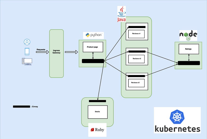 In today’s tutorial, let’s imagine we have an e-commerce website comprising four microservices: the product page, reviews, ratings, and details. Your team has successfully completed the work on the website, and now it’s time for deployment. You’ve chosen to deploy it in a Kubernetes cluster, as illustrated in the picture below.