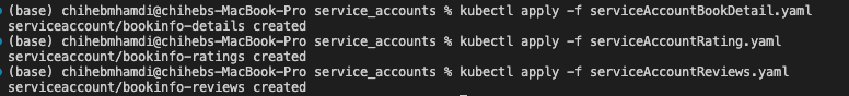 kubectl apply -f serviceAccountBookDetail.yaml kubectl apply -f serviceAccountRating.yaml kubectl apply -f serviceAccountReviews.yaml kubectl apply -f serviceAccountProductPage.yaml