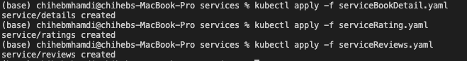 kubectl apply -f serviceBookDetail.yaml kubectl apply -f serviceRating.yaml kubectl apply -f serviceReviews.yaml kubectl apply -f serviceProduct.yaml